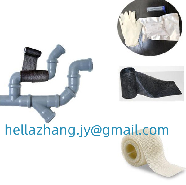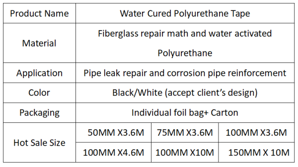 Water cured systerm, also named Pipe Repair Bandage which is a resin impregnated glass fibre-reinforced repair tape designed for the repairs and reinforce on damage or corroded pipes. Rolling tape packed into foil Plain bag with putty.